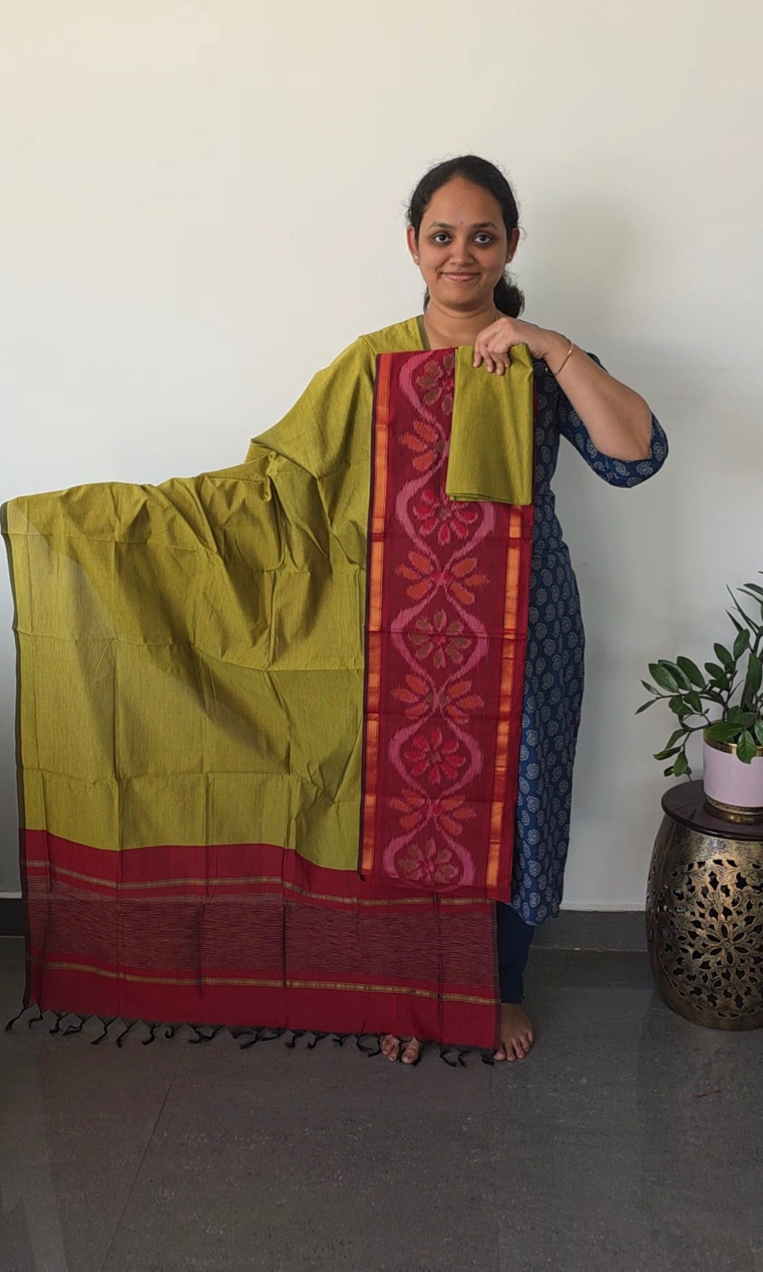 <p>This suit features a top crafted from Pochampally sico silk adorned with ikkat daman, measuring 2.5 meters. The bottom is made of 2 meters of silk fabric. The ensemble is completed with a sico silk shawl dupatta, approximately 2.5 meters long, finished with elegant tassels.</p>