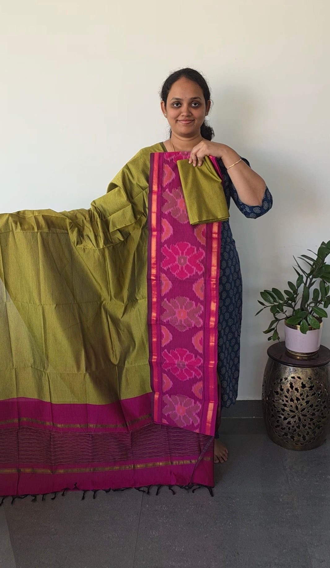 <p>This suit features a top crafted from Pochampally sico silk adorned with ikkat daman, measuring 2.5 meters. The bottom is made of 2 meters of silk fabric. The ensemble is completed with a sico silk shawl dupatta, approximately 2.5 meters long, finished with elegant tassels.</p>