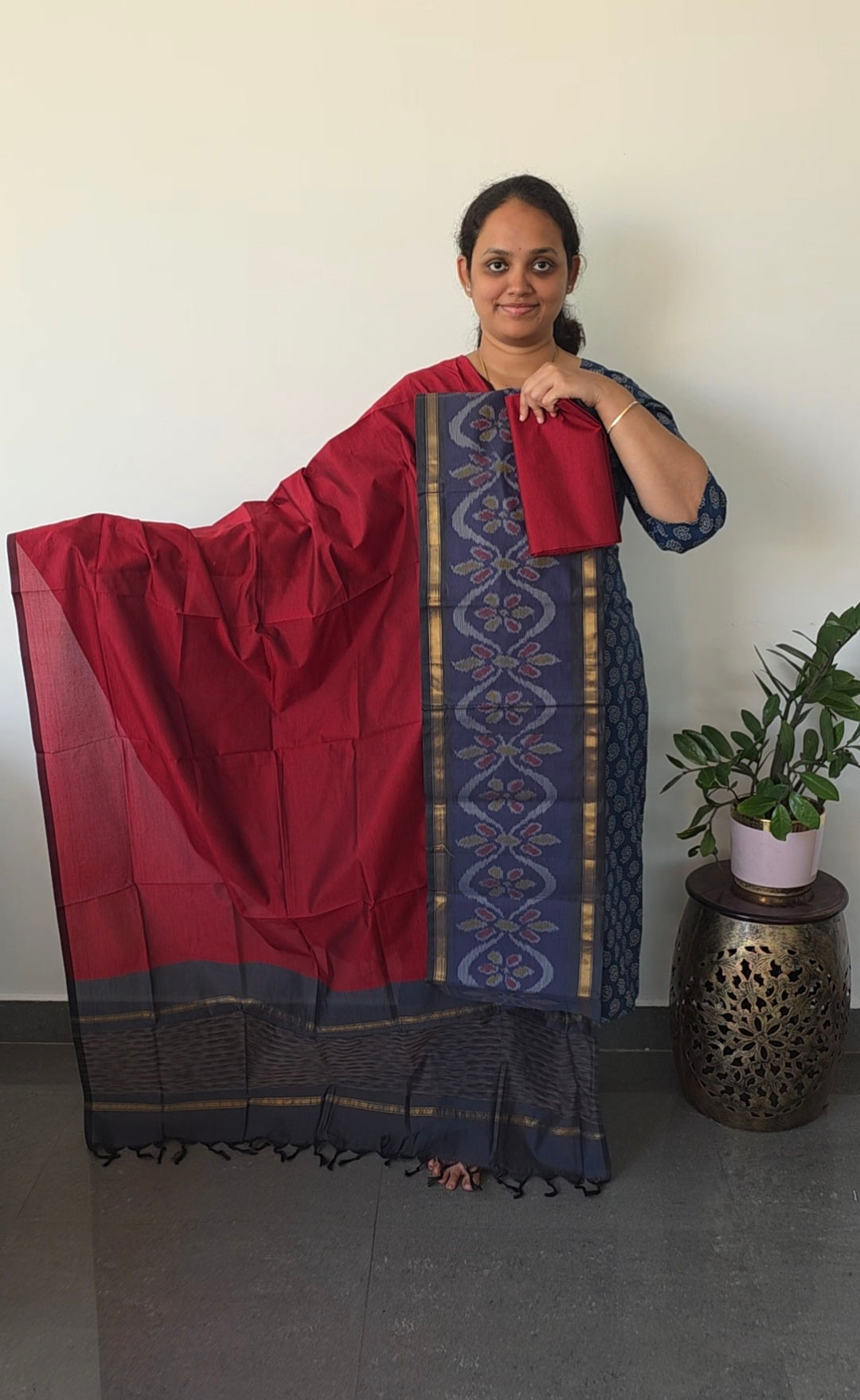 <p>This suit features a top crafted from Pochampally sico silk adorned with ikkat daman, measuring 2.5 meters. The bottom is made of 2 meters of silk fabric. The ensemble is completed with a sico silk shawl dupatta, approximately 2.5 meters long, finished with elegant tassels.</p>