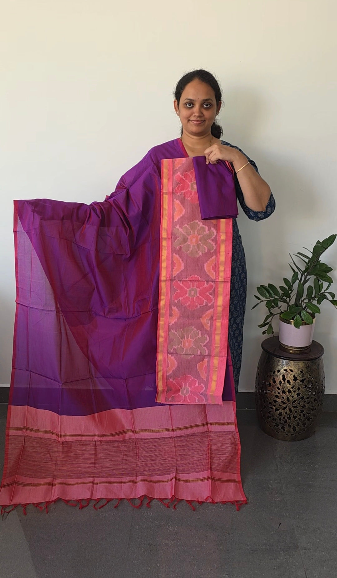 <p>This suit features a top crafted from Pochampally sico silk adorned with ikkat daman, measuring 2.5 meters. The bottom is made of 2 meters of silk fabric. The ensemble is completed with a sico silk shawl dupatta, approximately 2.5 meters long, finished with elegant tassels.</p>