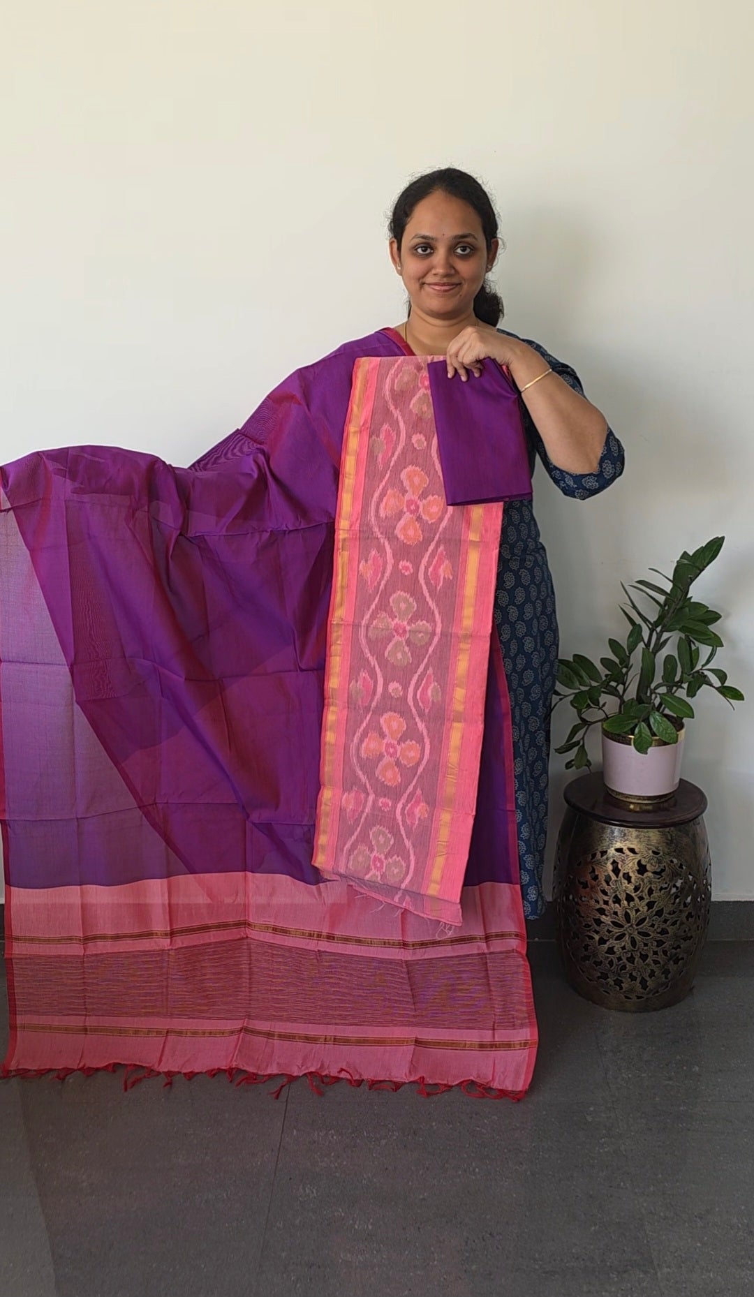 <p>This suit features a top crafted from Pochampally sico silk adorned with ikkat daman, measuring 2.5 meters. The bottom is made of 2 meters of silk fabric. The ensemble is completed with a sico silk shawl dupatta, approximately 2.5 meters long, finished with elegant tassels.</p>